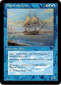 Ship of the Line was probably one of my most redesigned pieces of fictional card board. At one point it blew up lands, it destroyed blue creatures, it had islandwalk instead of vigilance. At the end, I feel this was the best design.